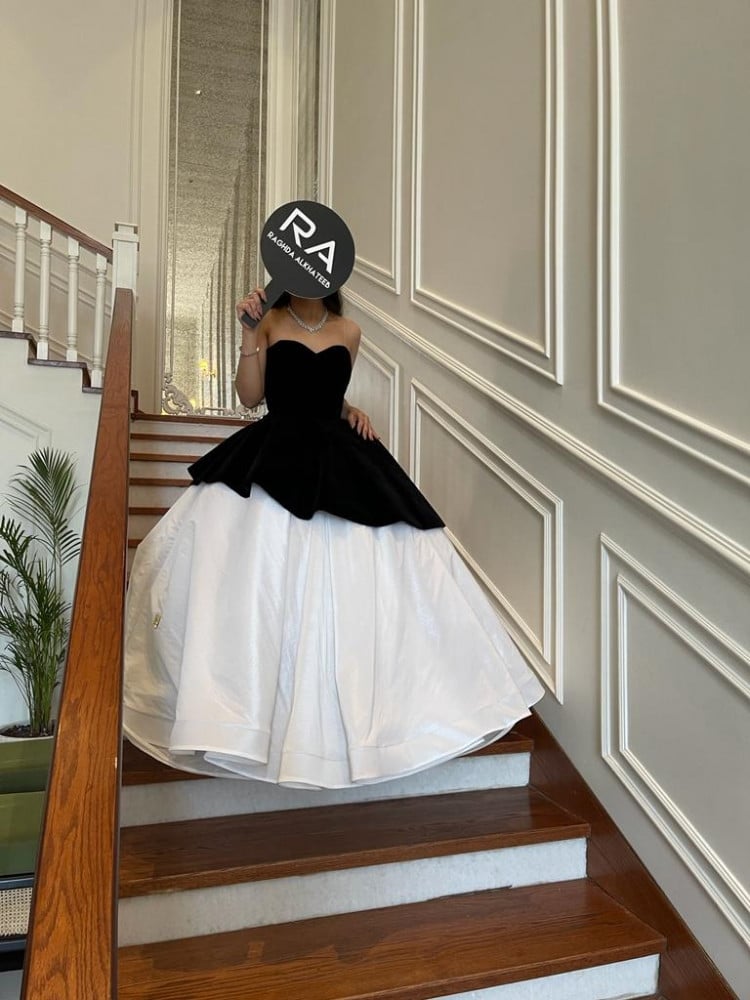 فستان مكشوف الاكتاف بطبقتين اسود مخمل من الاعلى وابيض شانتون من الاسفل بطول مكسي .. مناسبة للحفلات الرسميه وحفلات الزفاف