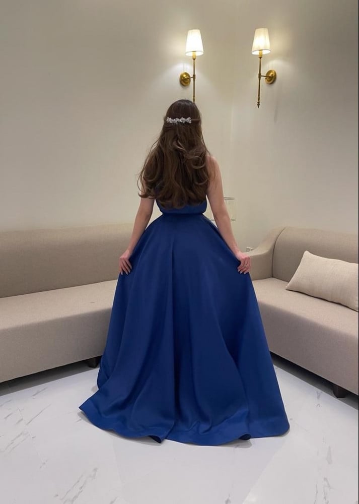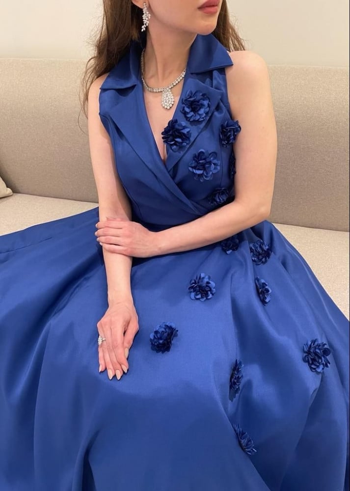 فستان ازرق للحفلات ب اكمام ومضاف إليه ورد صناعه يدويه .. مكسي ومن الخلف ذيل مناسبة للحفلات الرسميه وحفلات الزفاف