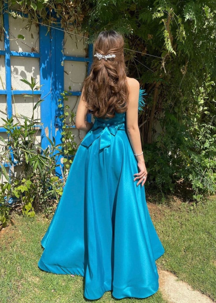 فستان سماوي للحفلات مكشوف الأكتاف بريش على منطقة الصدر .. مكسي مناسبة للحفلات الرسميه وحفلات الزفاف